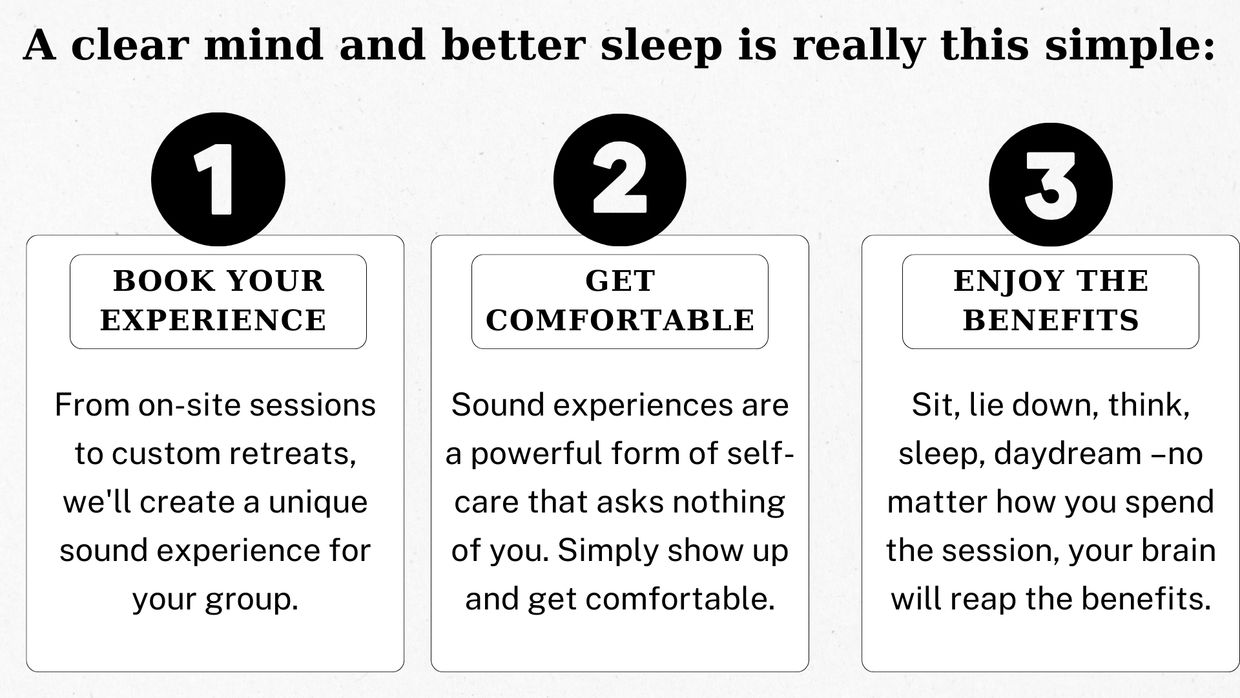 The secret to living well is as simple as getting quality rest. Sound is the unsung hero that makes passive rest achievable for anyone. As your brain tunes into the rhythm, vibrations, and frequencies of a sound experience (commonly referred to as "sound baths"), the nervous system shifts from a state of stress to a state of relaxation – where deep healing and optimal performance become possible.